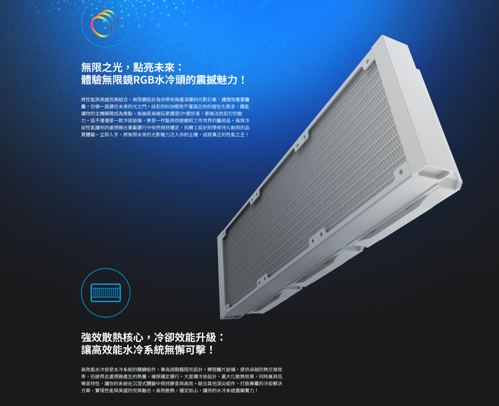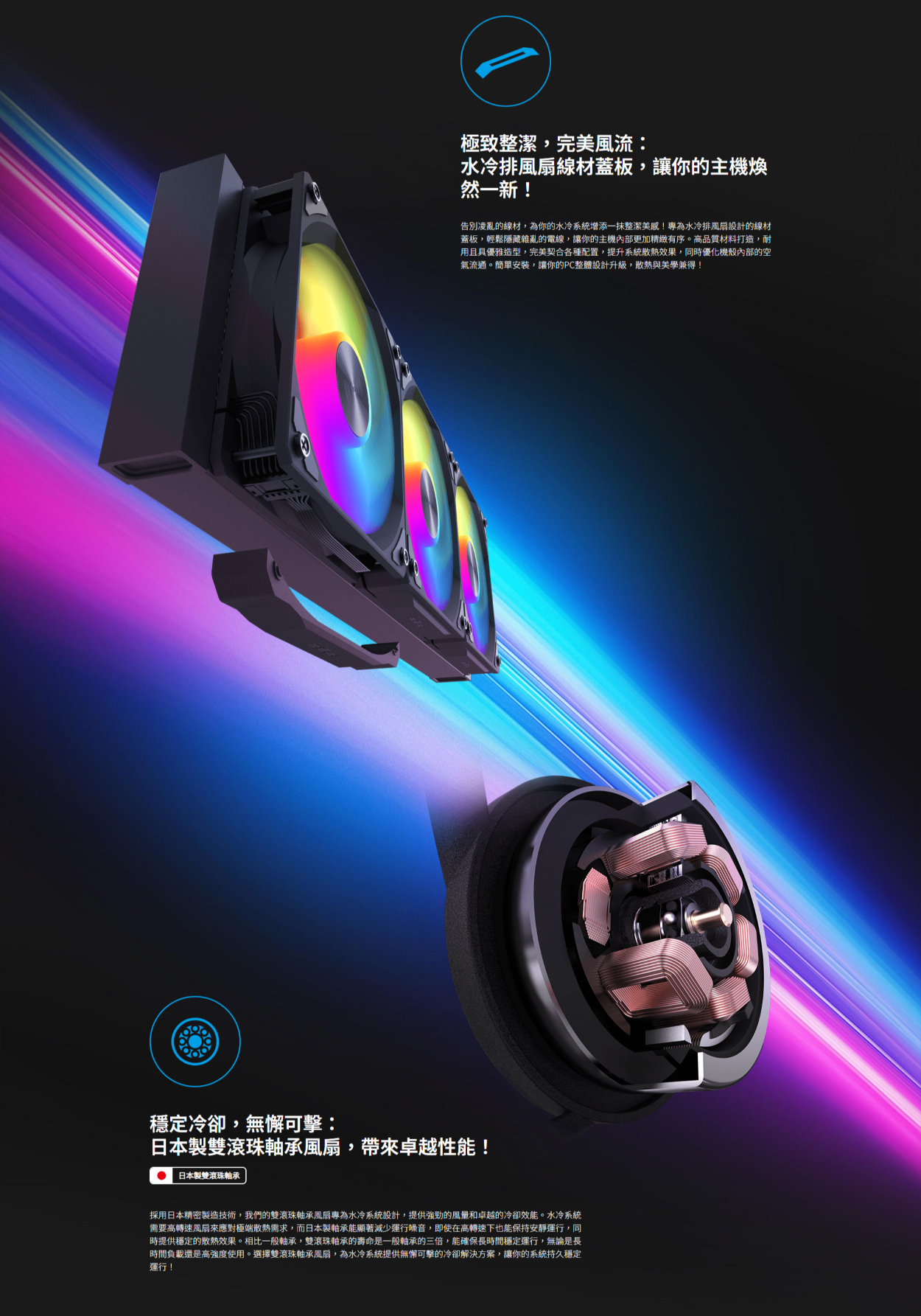✦ 升級了水冷液配方、打造最佳效能配比,更針對銅板貼合度進行精密校調,大幅提升熱能傳導效率,高密度鰭片設計,提供最佳散熱效能