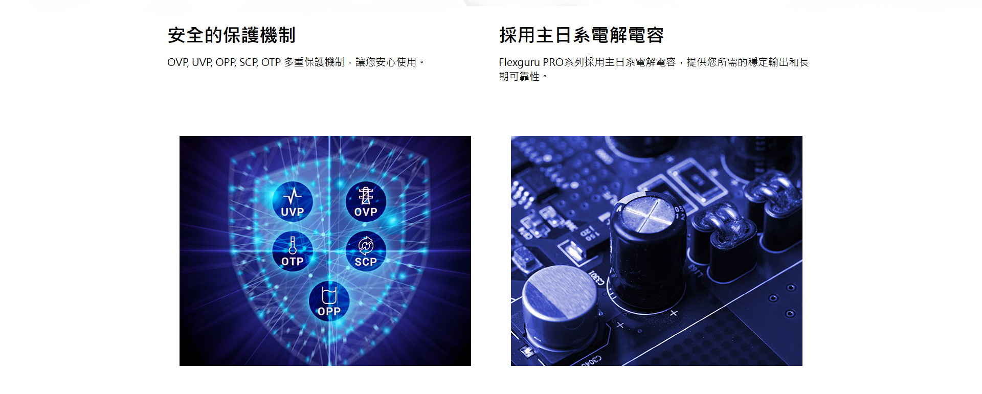 ✦ 完整的保護機制: UVP, OVP, SCP, OPP, OTP