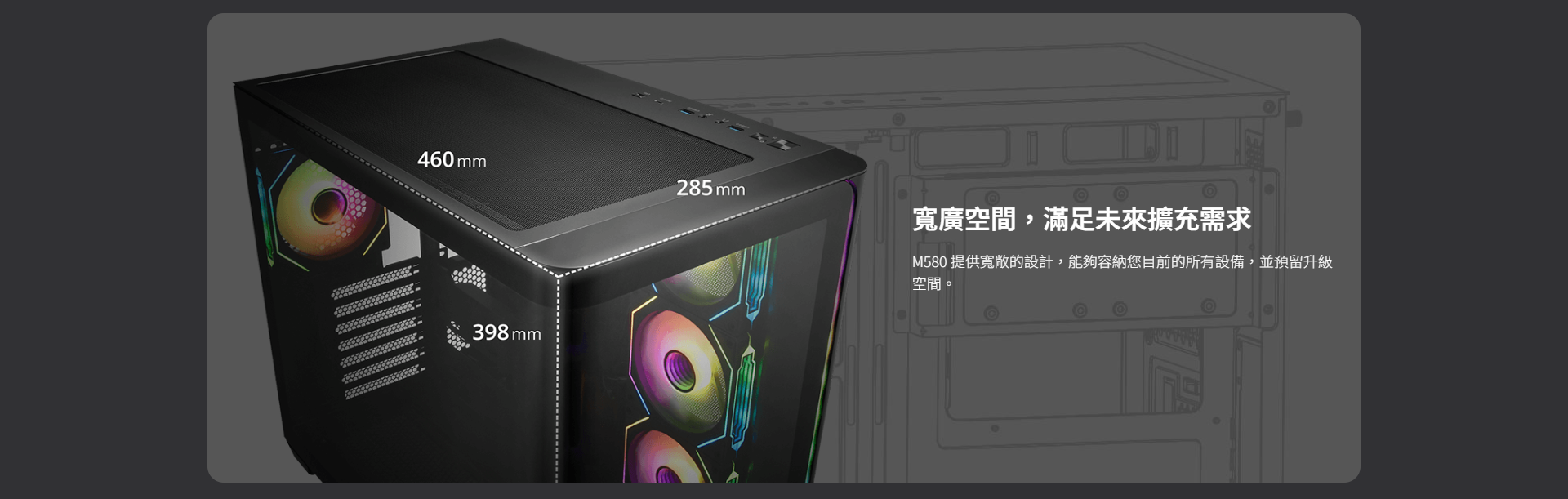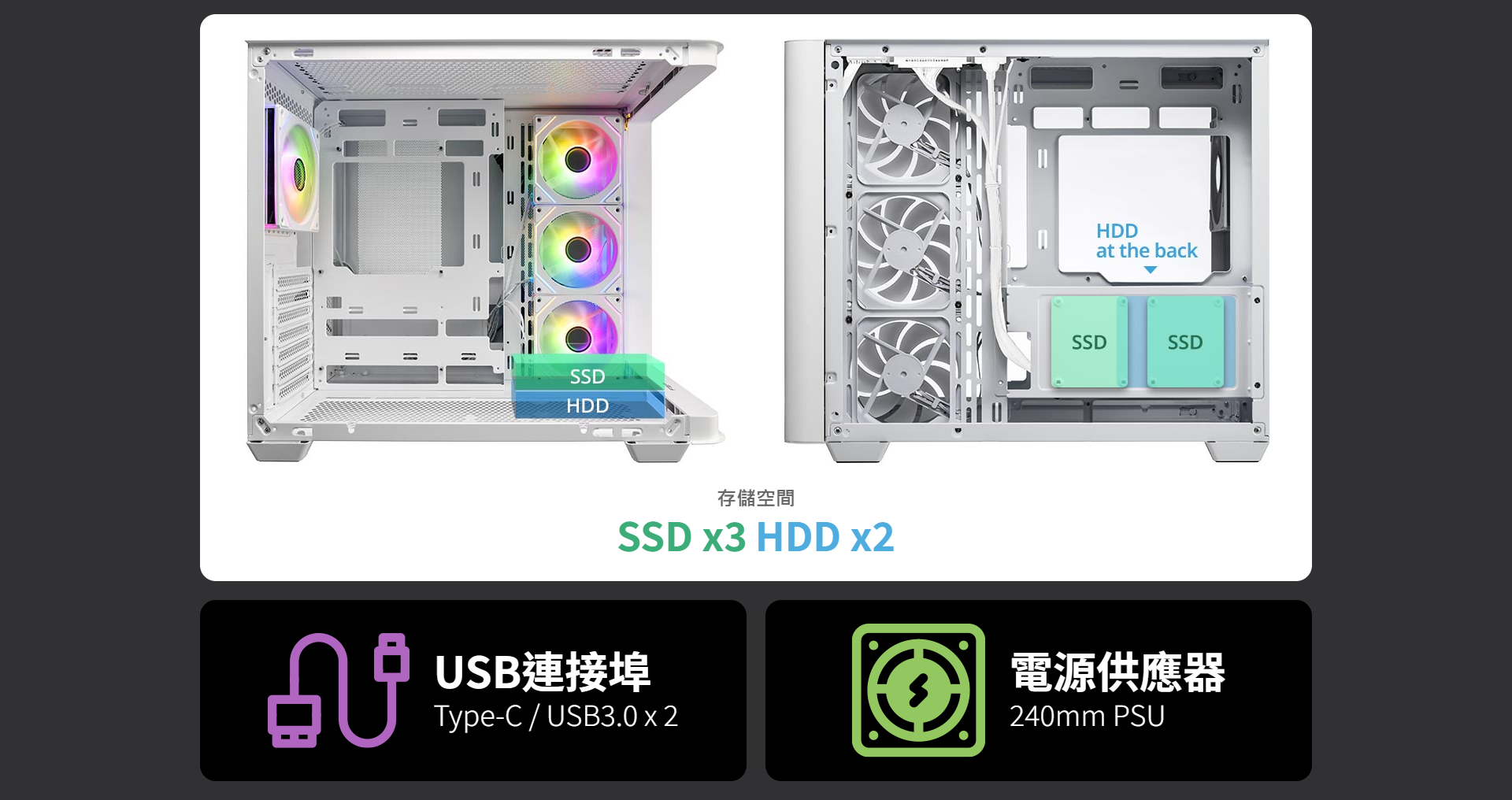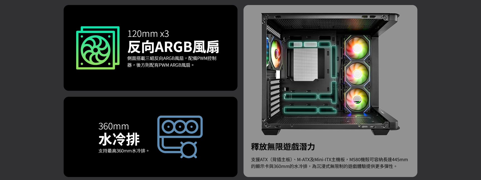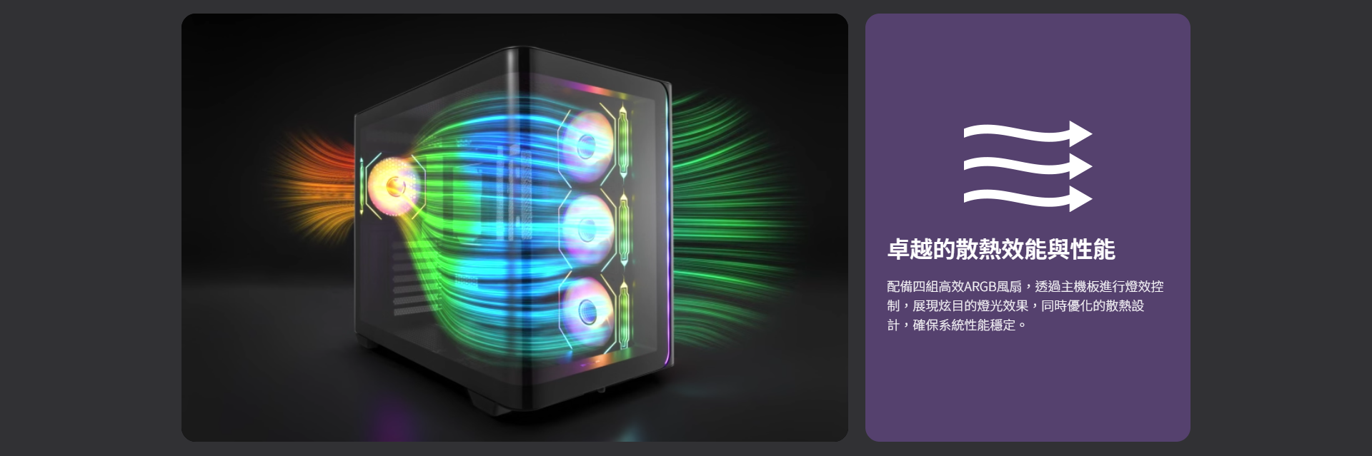 散熱系統: 側:120mm 反向 ARGB x 3 搭配 PWM 控制器