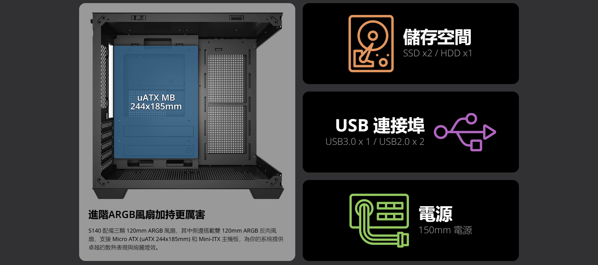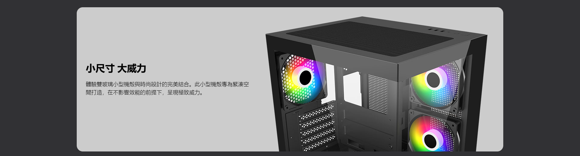 散熱系統:Side: 120mm reverse ARGB x 2 control by Fan