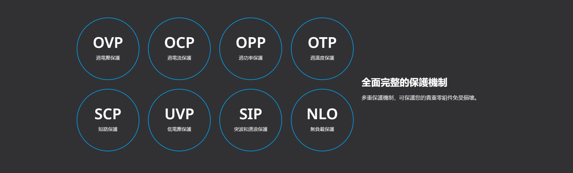 ✦ 全面性保護機制 OVP, OCP, OPP, OTP, SCP, UVP, SIP, NLO